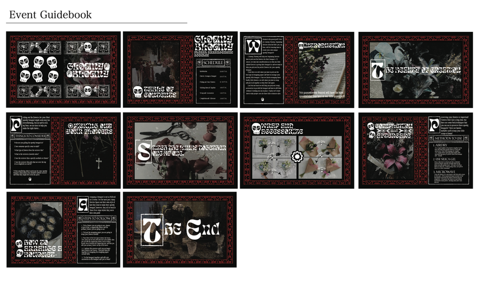 This project was an experimental graphic design type of work, so for this project it wasn't just about making a brand alone. This project focused more on the dimensions of designing a kiosk and an event for the brand. As much as I had a few interesting ideas, I ultimately decided to go with a gothic floral brand. Many people already love flowers, especially when they are customized and tailored to the person receiving them.